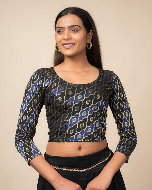 Manek Midnight Black Mirror Ajrakh Saree Blouse – Festive Stretchable by Advi
