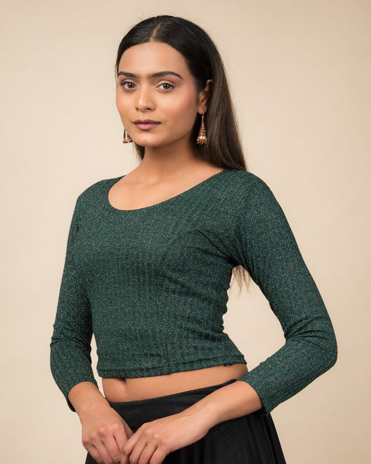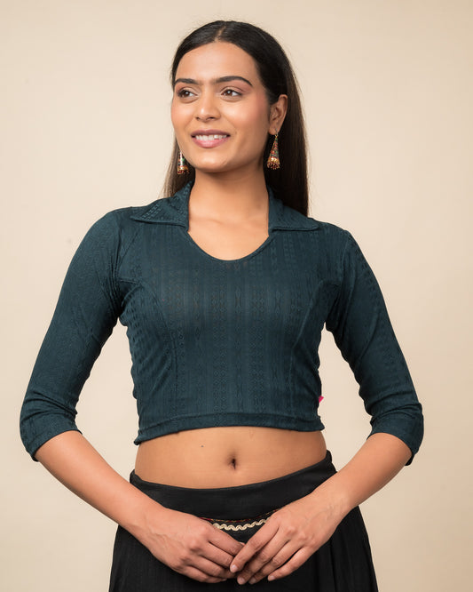 Rakhi Bottle Green Ikat Collar Long Sleeve Stretch Blouse advi