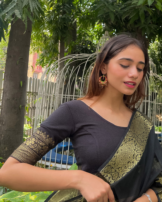 Swarna Black Stretchable Blouse with Ornate Gold Border and Boat Neck by Advi