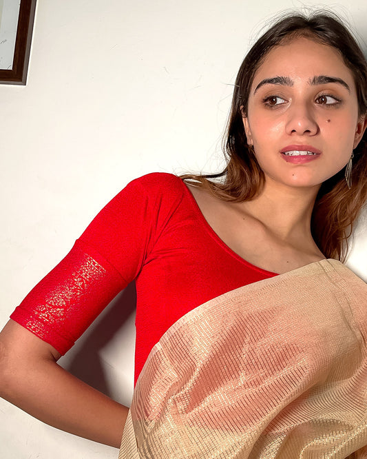 Swarna Red Gold Border Blouse in Soft Lycra with Boat Neck and Stretch by Advi