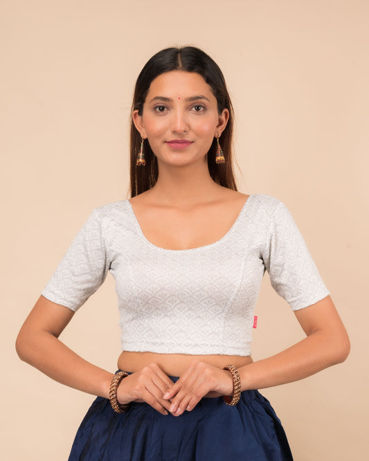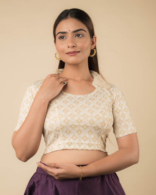 Kalki Silver Jacquard Blouse Hand Embroidered Collar – Stretchable Readymade Fit