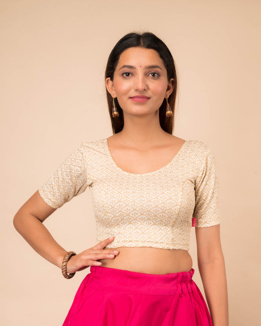 Bebo Beige Gold Zari Saree Blouse – V Neck Stretchable Ready to Wear Blouse