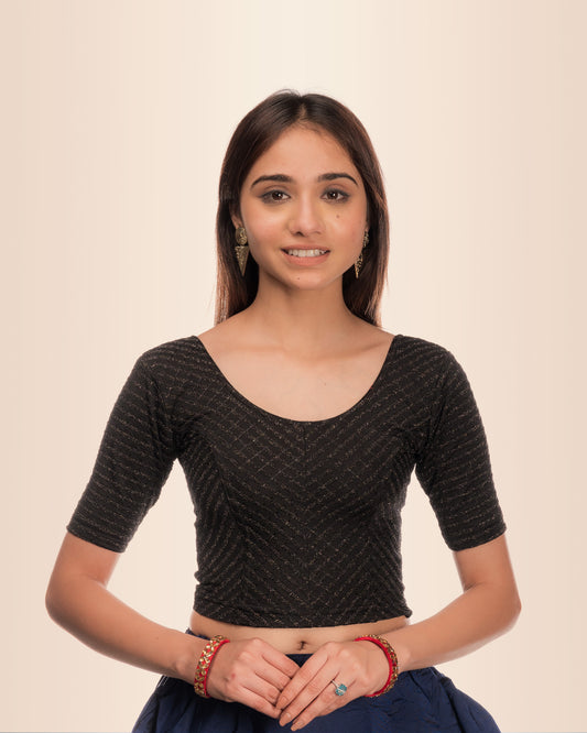 Jhumki Black Metallic Jhumki Buti Elbow Sleeve Stretchable Blouse by Advi