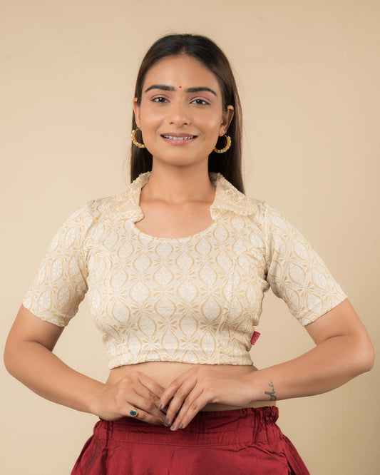 Bebo Cream Gold Stretchable Blouse – Readymade V Neck Gold & Silver Zari Designer Blouse