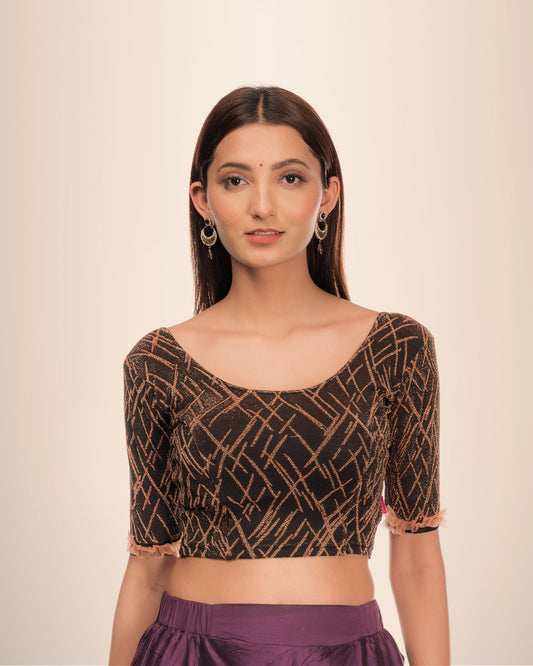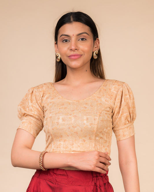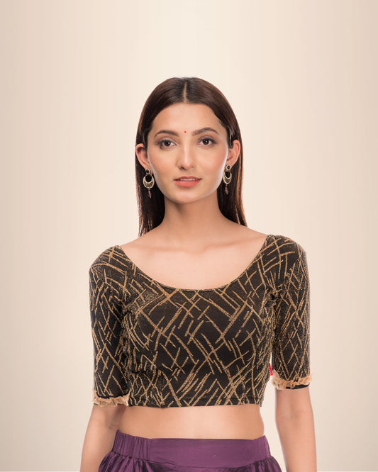 Disha Rani Zig Zag Gold Foil Puff Sleeve Elbow Length Stretchable Blouse Adv