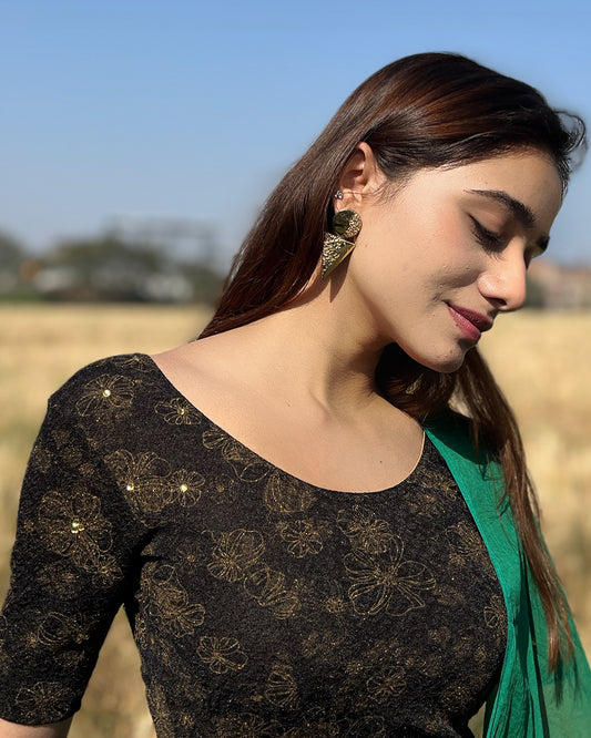Taara Bottle Green Knitted Blouse with Floral Gold Foil by Advi – Readymade