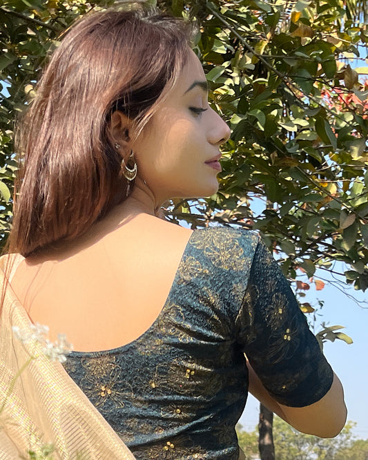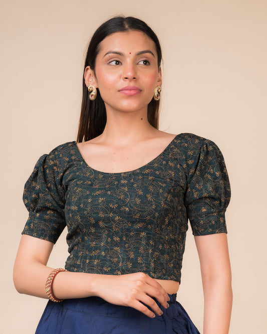 Leela Bottle Green Stretchable Blouse with Metalic Print and Buckle Advi