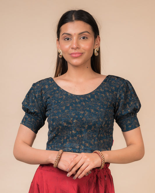 Disha Navy Zig Zag Foil Puff Sleeve Everyday Wear Elbow Stretchable Blouse Advi