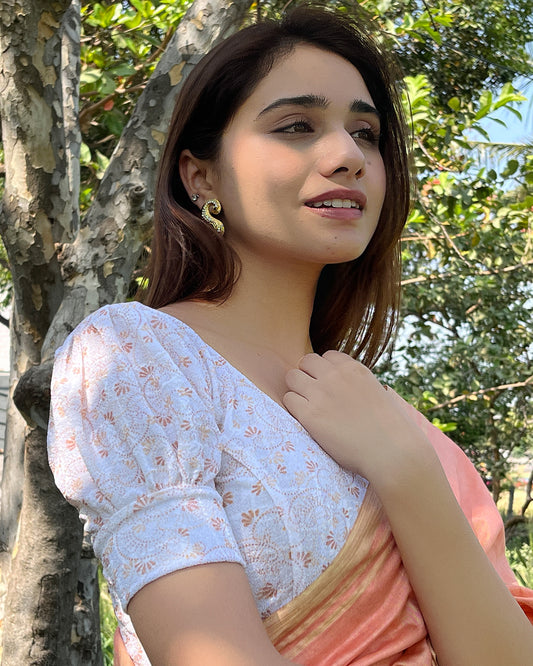 Disha White Zig Zag Foil Gold Wavy Pattern Puff Sleeve Ready To Wear Blouse Advi