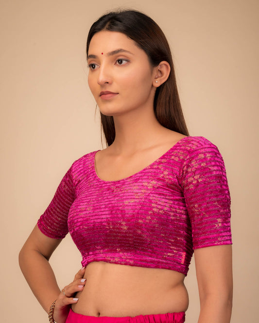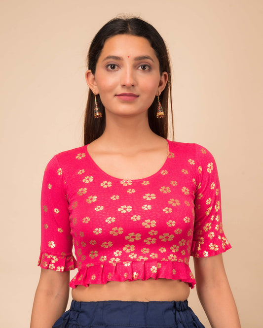 Vasu Velvet Overlap Gold Foil Rani V Shaped Back Neck Blouse | Stretchable