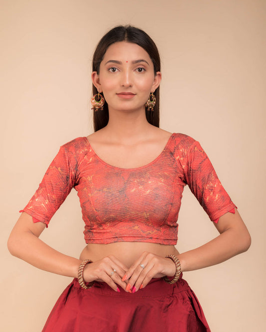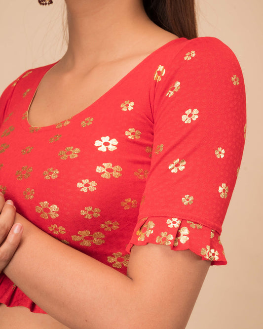 Vasu Velvet Gold Foil Red V-Shaped Back Saree Blouse | Stretchable