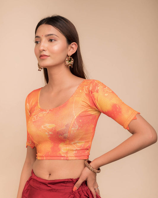 Dhaatu Digital Print With Silk Trims Orange Stretchable Readymade Blouse