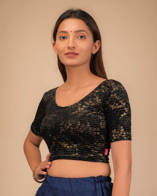 Vasu Velvet Gold Foil Classic Black With V Shaped Back Readymade Saree Blouse