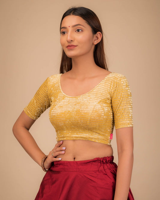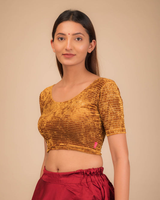 Vasu Velvet Gold Foil Stripes Dark Gold Readymade Saree Blouse-Elbow Sleeve