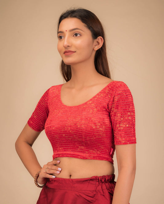 Preet Gold Zari Keri Banarasi Red Ready-To-Wear Stretchable Blouse | Elbow Sleeve