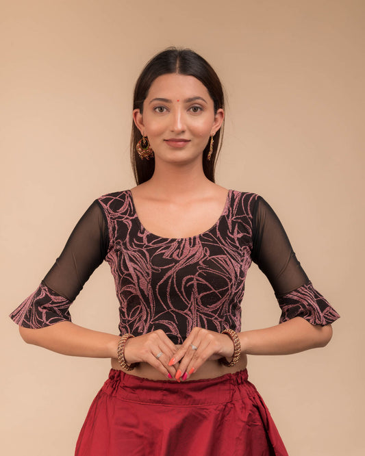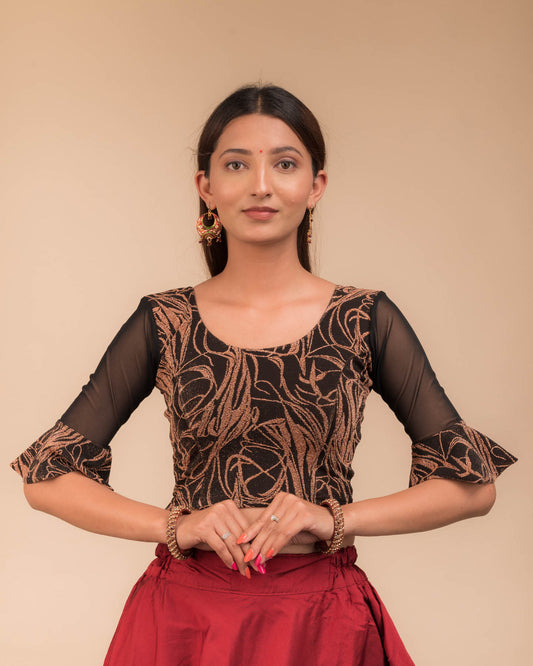 Nisha Copper Black Metallic Shiny Bell Sleeve Stretchable Slip On Festive Blouse Advi