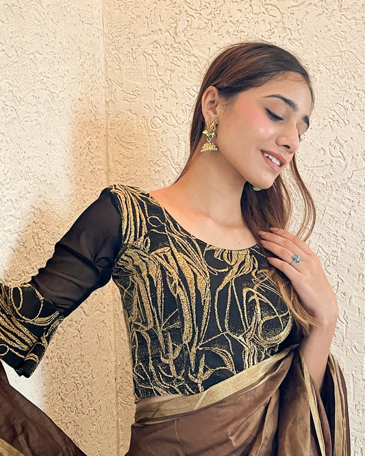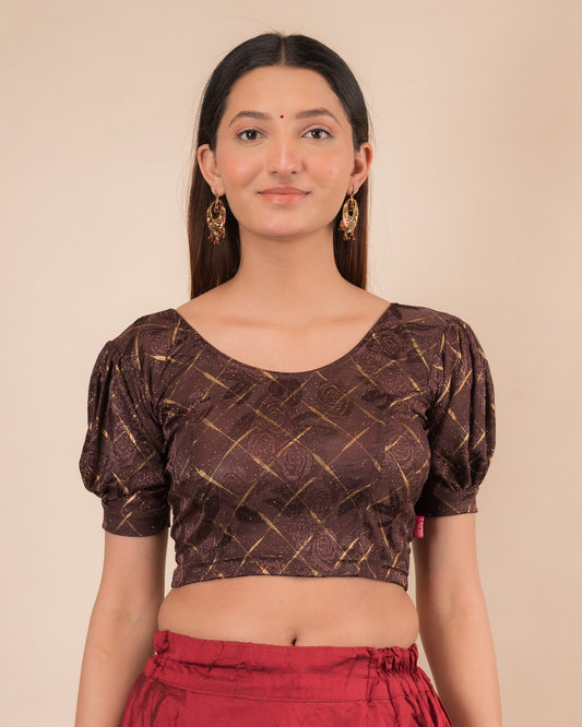 Gauri Coffee Gold Glitter Puff Sleeve Stretchable Melange Blouse Advi