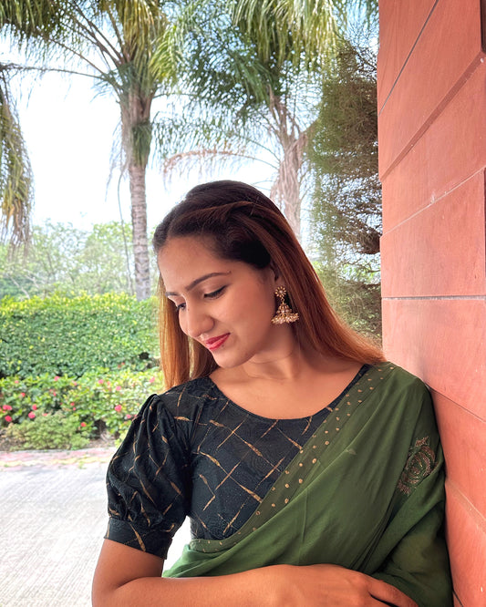 Gauri Bottle Green Puff Sleeve Streachable Blouse with Gold Glitter By Advi