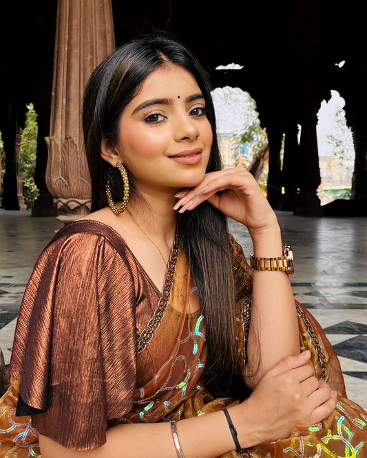 Takshila Copper Fancy Blouse with Zari Appliqué and Organza Elbow Sleeve by Advi