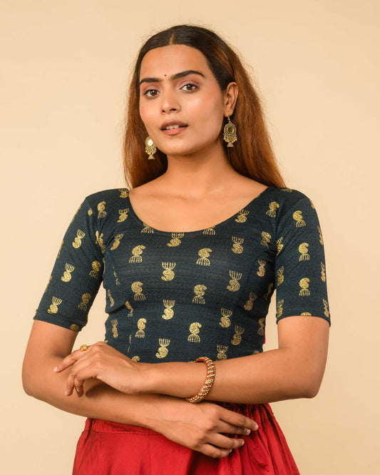 Jhumki Peacock Green Jhumki Gold Foil Print Elbow Sleeve Stretchable Blouse by Advi