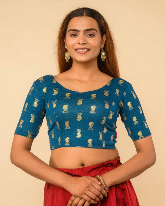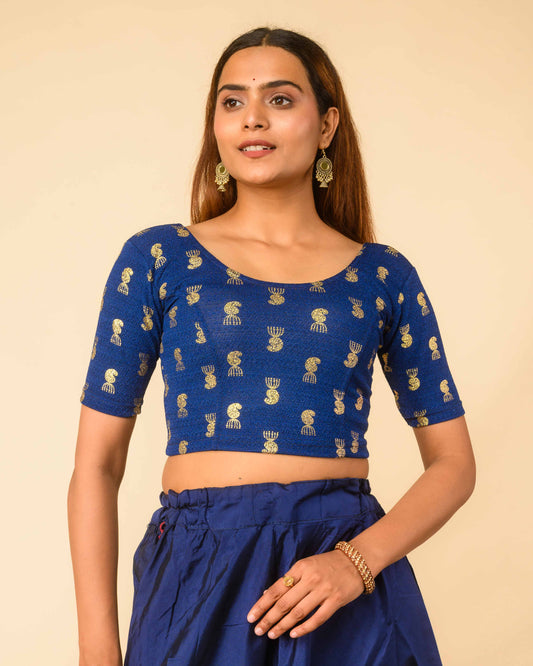Jhumki Royal Blue Jhumki Gold Foil Print Elbow Sleeve Stretchable Blouse by Advi