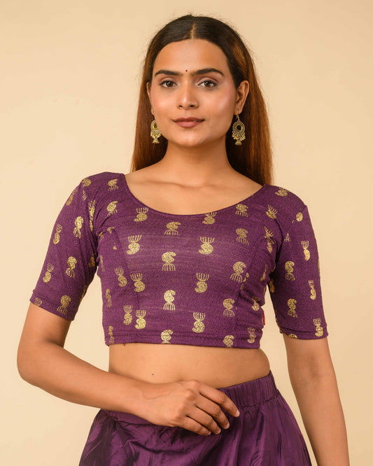 Jhumki Purple Jhumki Gold Foil Print Elbow Sleeve Stretchable Blouse by Advi