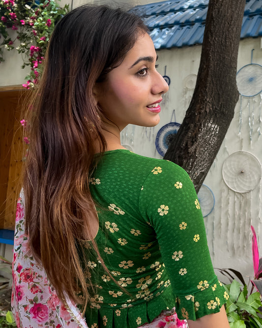 Daisy Green Gold Flower Print Pleated Jacquard Slip On Saree Blouse by Advi