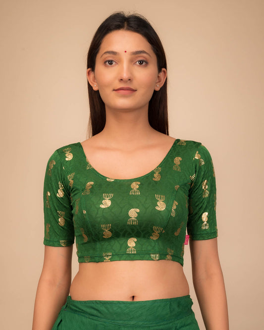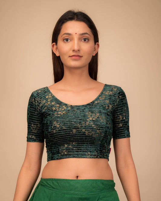Vasu Velvet Overlap Gold Foil Green Stretchable Saree Blouse-Comfortable