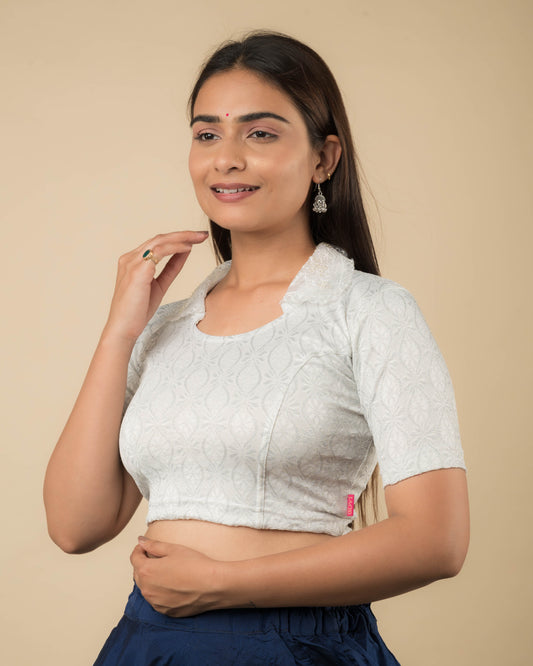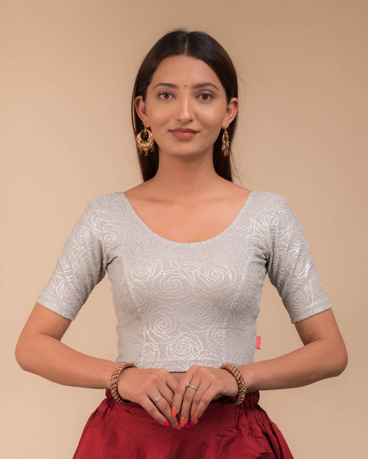 Rosey Metallic Rose Emboss Silver Stretchable Saree Blouse | Party Ready