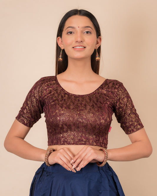 Aabha Coffee Blouse Advi Gold Floral Print Ready to Wear Stretchable Melange