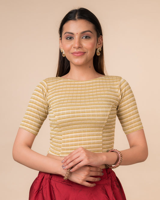 Nupur Cream Zari Stripe Boat Neck Stretchable Elbow Sleeve Blouse Advi