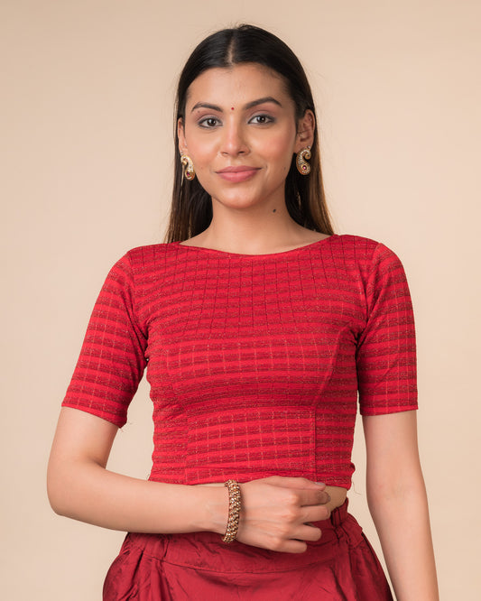 Nupur Red Zari Stripe Boat Neck Blouse with Elbow Sleeves by Advi