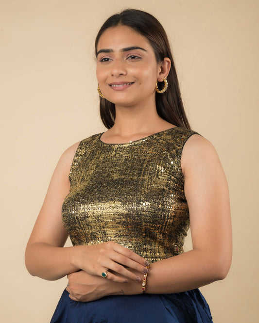 Tira Advi Gold Metallic Sequin Blouse – Sleeveless Backless Slip On for Cocktail Look