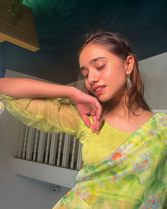 Kaanchi Green Jacquard Blouse with Organza Sleeves and Gold Foil by Advi