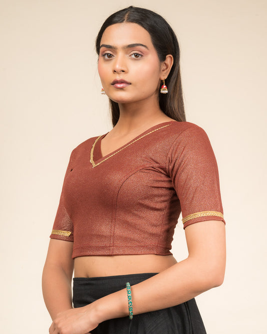 Nohreen Coffee Shimmer V Neck Blouse with Gold Lace | Stretchable Saree Blouse