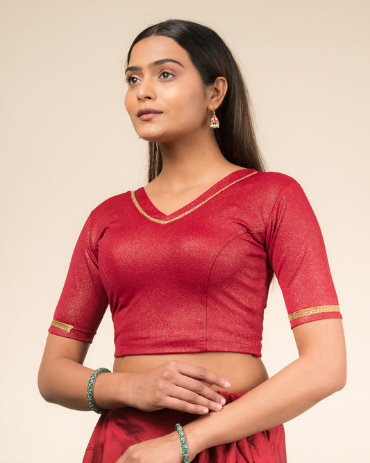 Nohreen Maroon V Neck Blouse with Shimmer & Lace | Stretchable Saree Choli