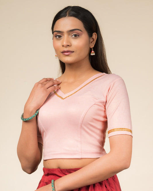 Nohreen Pink Shimmer V Neck Blouse with Gold Lace | Stretchable Saree Blouse