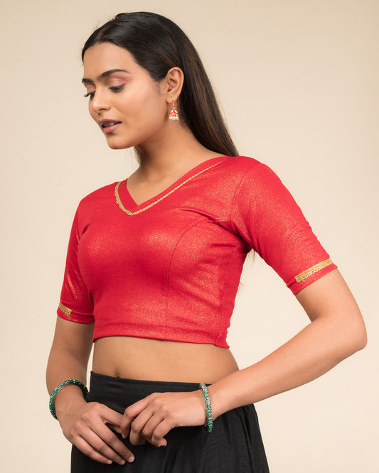Nohreen Red Shimmer V Neck Blouse with Gold Lace | Readymade Wedding Choli