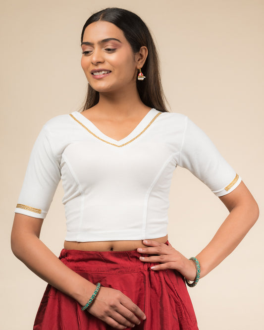 Nohreen White Solid V Neck Shimmer Blouse with Lace | Stretchable Choli Fit