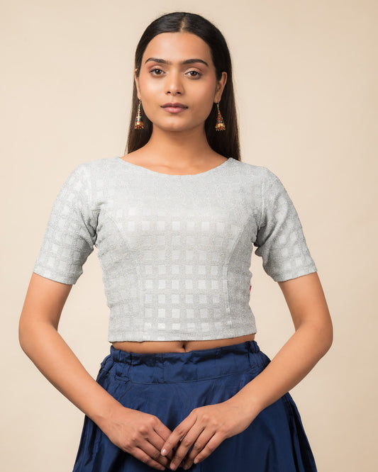 Varuna Frost Silver Self Design Blouse with Tie-Up Back – Stretchable Saree Blouse
