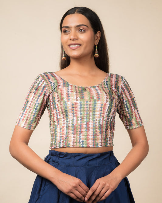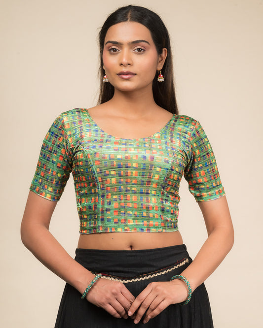Dunki Nature Green Print Multicolour Velvet Zari Stripes Stretchable Slip On Blouse