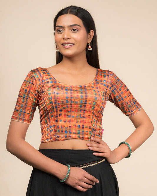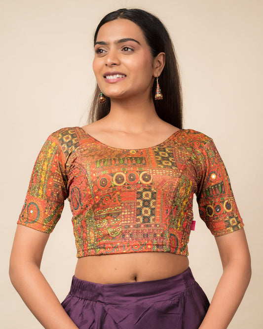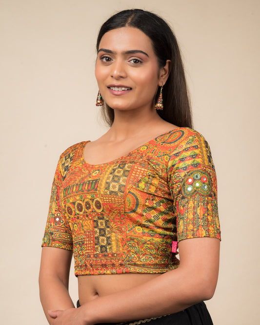 Aaina Jacquard Orange Blouse with Kutch Print Mirror Work Stretchable Fit | Festivewear