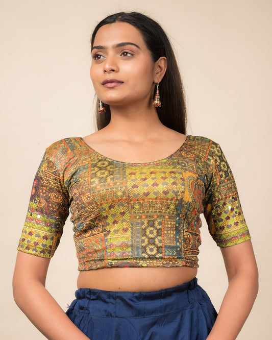 Tijori Digital Vintage Print Shimmer Stretchable Slip on Blouse
