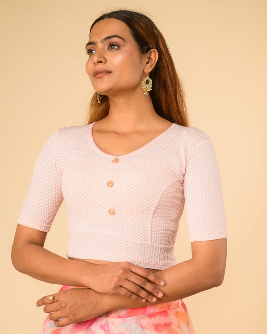 Arkha Pink Floral Print Velvet Saree Blouse – Stretchable, Round Neck, Elbow Sleeves
