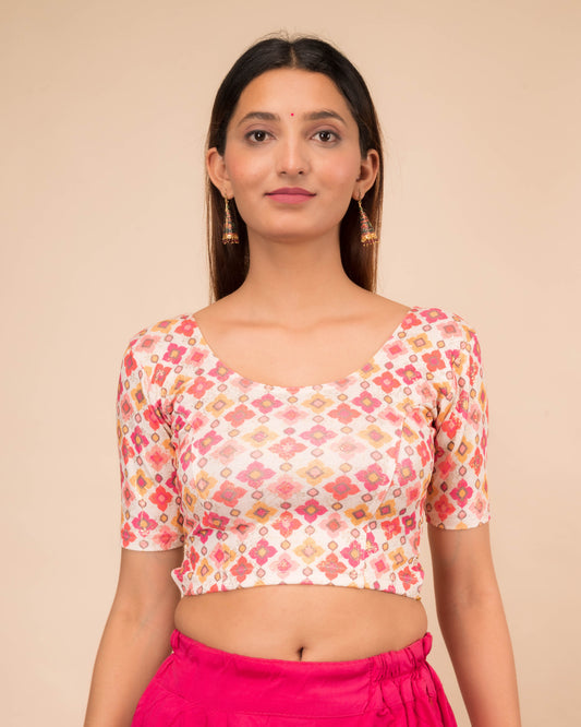 Tijori Digital Pink Print Shimmer Stretchable Slip on Blouse