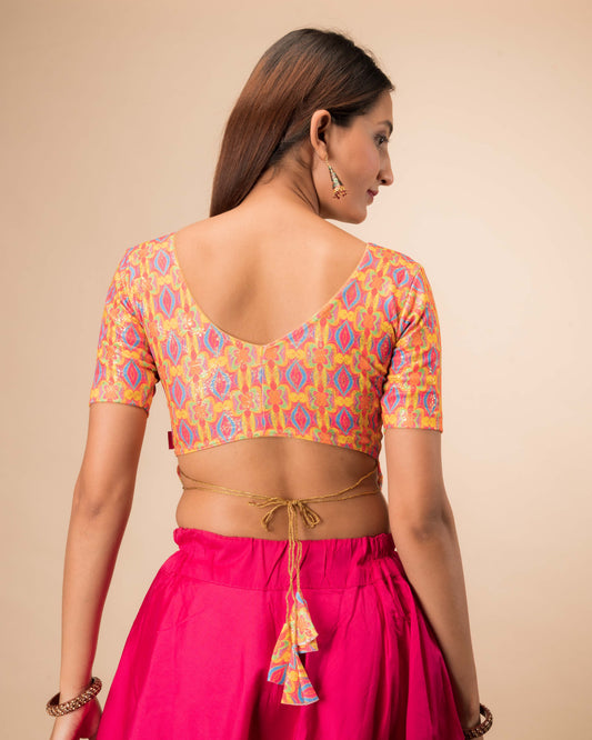 Rasiya Yellow Velvet Blouse with Gold Print and Two Tie-Up Dori Back by Advi