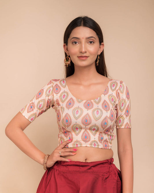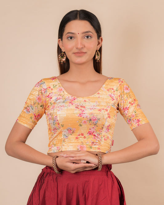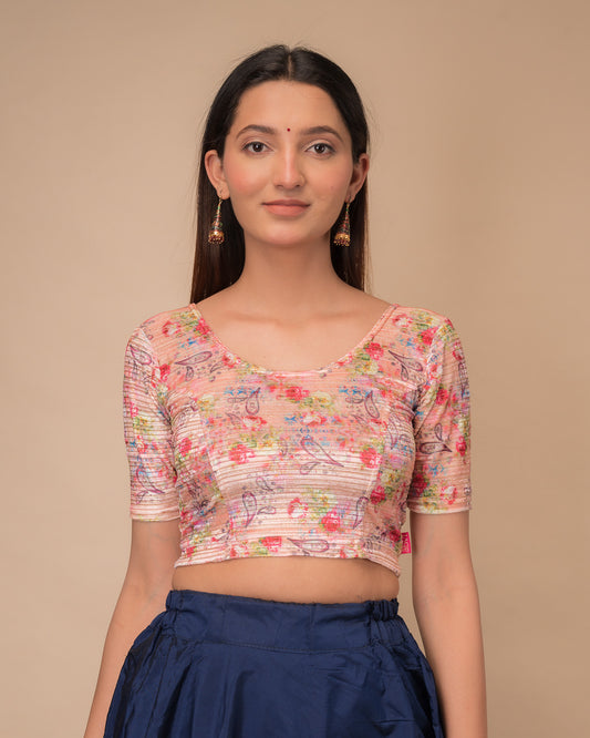 Arkha Peach Floral Print Velvet Blouse – Stretchable Readymade Saree Blouse