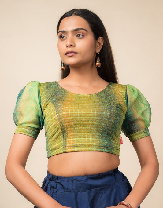Kohima Green Printed Blouse with Metallic Puff Sleeves | Readymade Saree Blouse