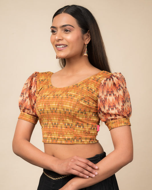 Kohima Ikat Print Stretchable Blouse with Metallic Puff Sleeves | Saree Choli