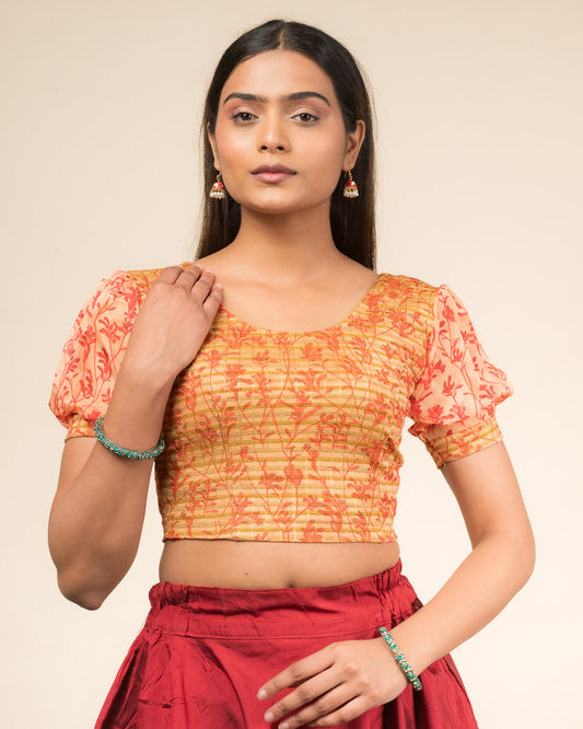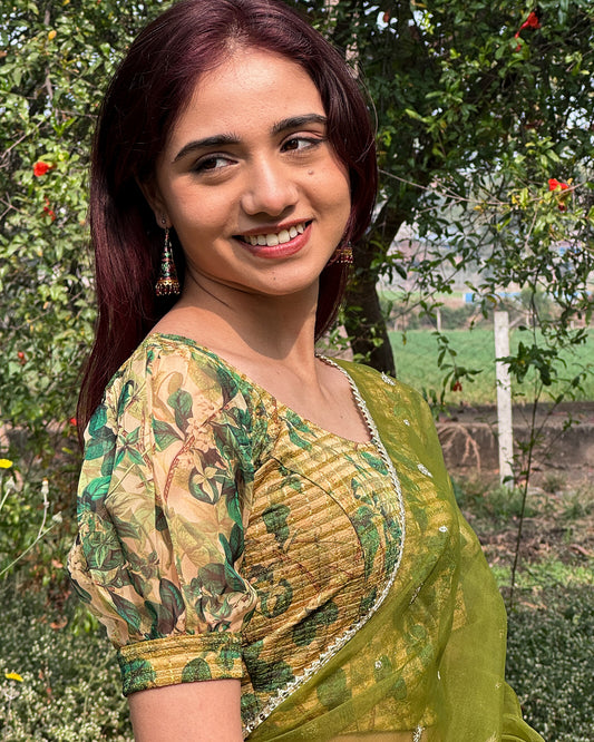 Kohima Leaf Print Metallic Blouse | Readymade Puff Sleeve Choli for Sarees